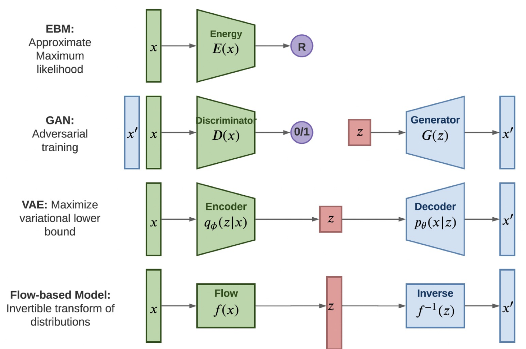 | Flow-based: | Use invertible mappings to transform between data and latent variables; trained via exact maximum likelihood. |