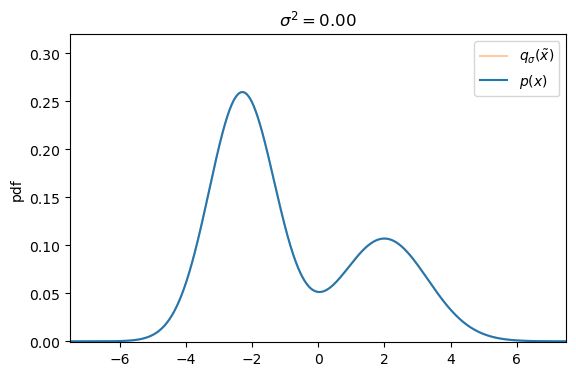 \[\tilde{\mathbf{x}} = \mathbf{x} + \boldsymbol{\epsilon} \quad \text{with} \quad \boldsymbol{\epsilon} \sim \mathcal{N}(0, \sigma^2 \cdot \mathbf{I}).\]We will refer the corrupted data distribution as $q_\sigma(\tilde{\mathbf{x}})$.
