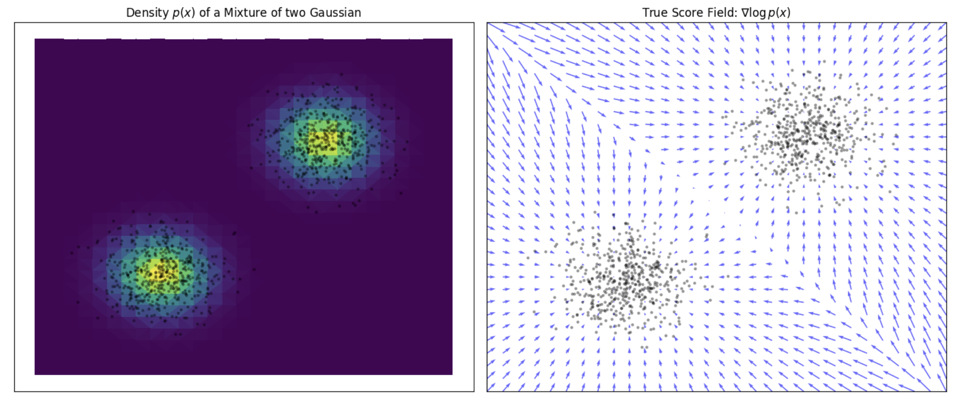 \[\nabla_{\mathbf{x}} \log p(\mathbf{x}),\]and a model for the score function is called a score-based model, which we denote as $s_\theta(\mathbf{x})$.