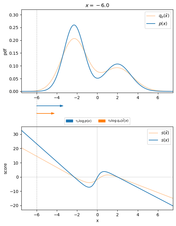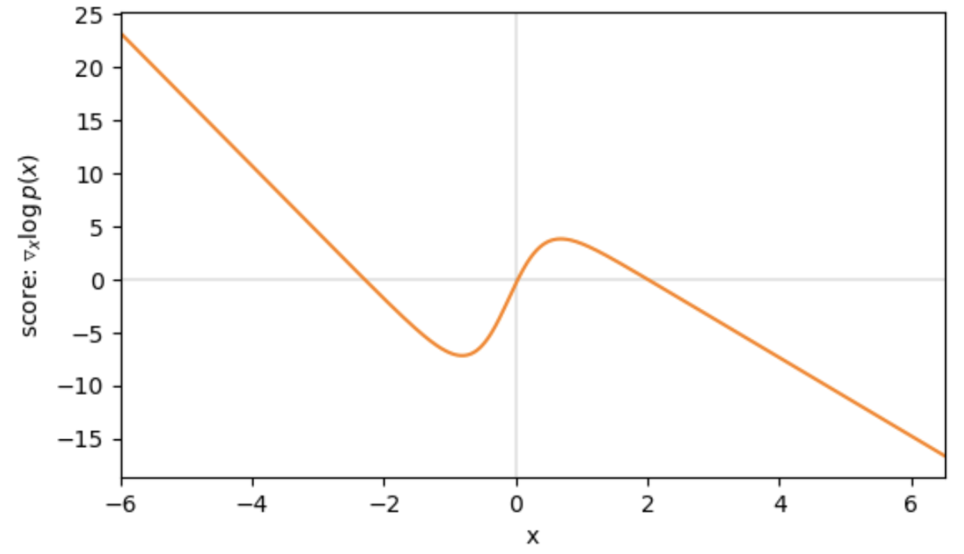 Let’s assume our true data distribution is a simple univariate Gaussian Mixture Model (GMM), as displayed in the following figure. The value of the corresponding score function at each position $x$, tells us the direction of higher density. For example, if we are at $x = -4$ we can see that the score is positive and thus, if we want to make $x$ slightly more likely under $p(x)$, we need to move to the right. Contrarily, if we evaluate the point $x = 4$, the negative score tells us that for a higher density region we need to move to the left.